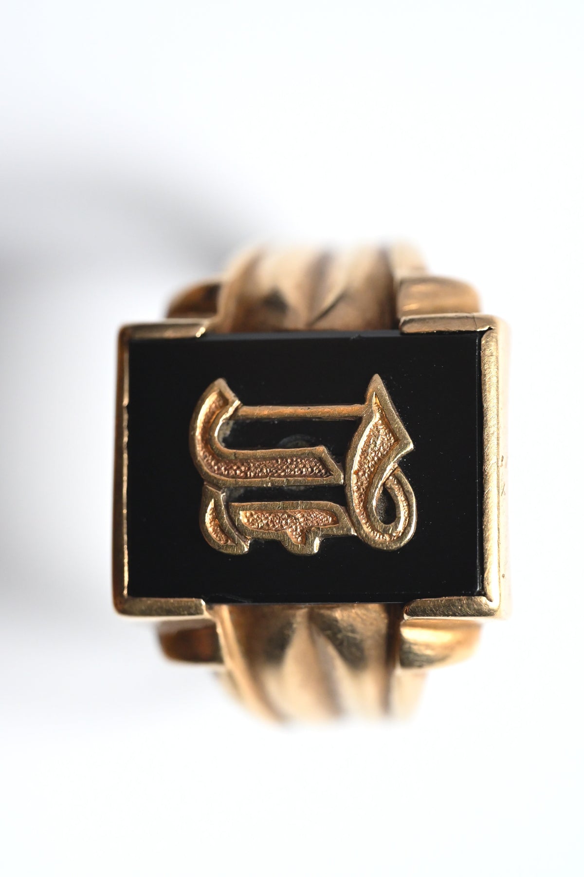 最大の特徴は、オニキスの天面に配されたオールドイングリッシュ体のイニシャル「L」。